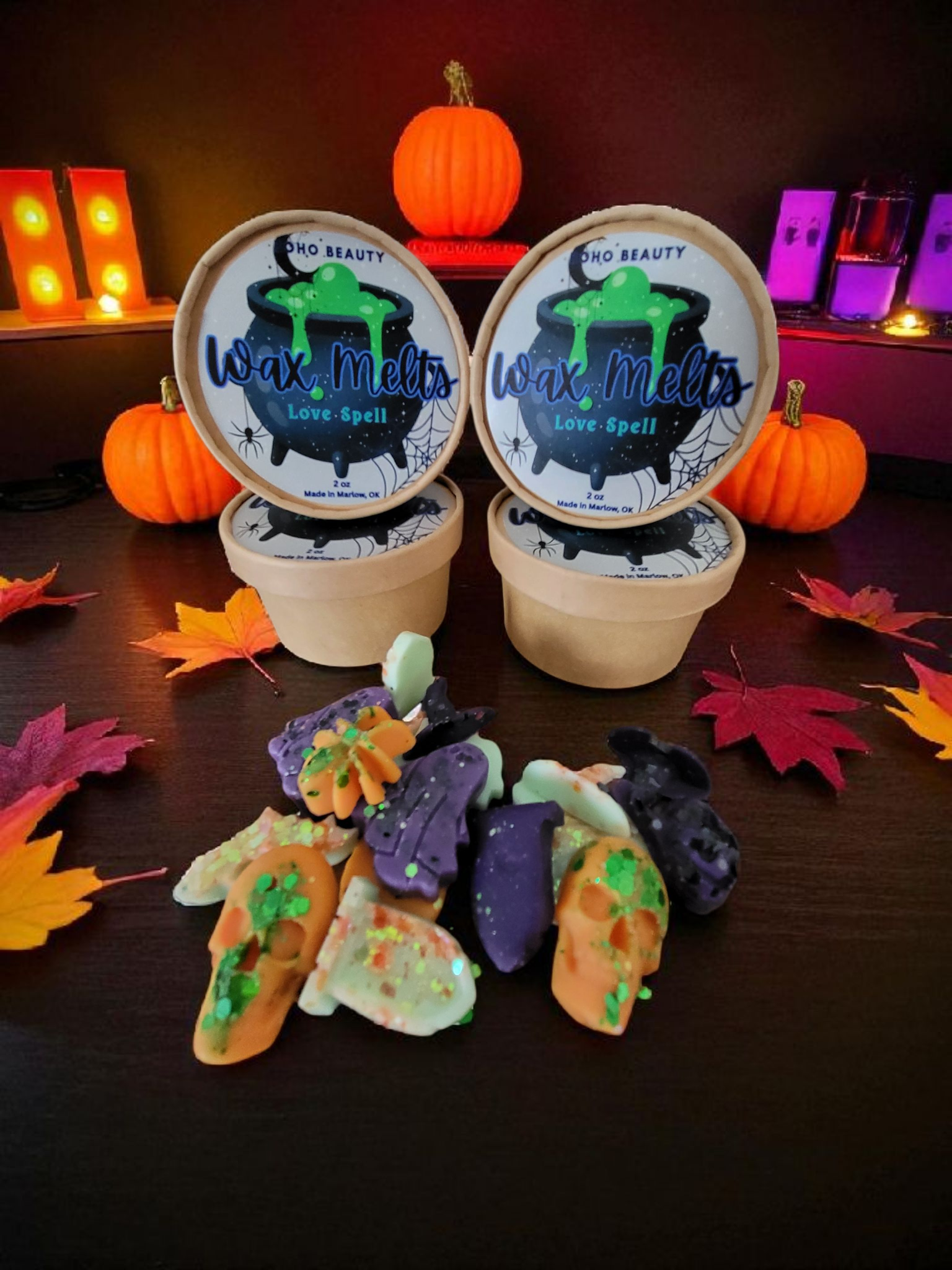 Fall under the spell with these Halloween-themed wax melts in vibrant orange green, and purple. Shaped like skulls, ghosts, and more, each glittery melt is scented in the enchanting fragrance of Love Spell.